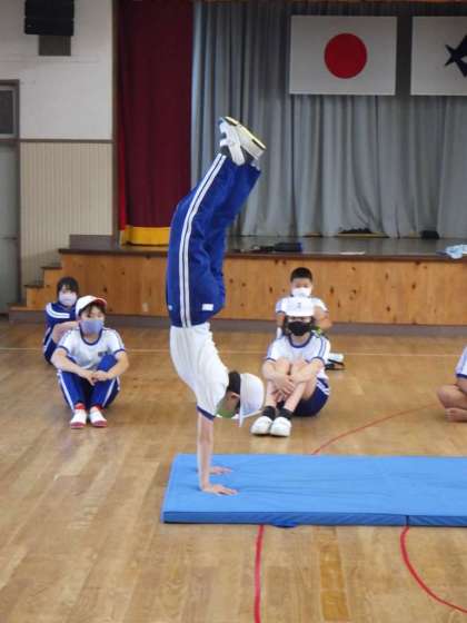 マット運動の発表会でした。一人5つの技を組み合わせて、発表技を何度も練習してきました。壁倒立や開脚前転、倒立ブリッジなど、学習する前にはできなかった技ができるようになりました。