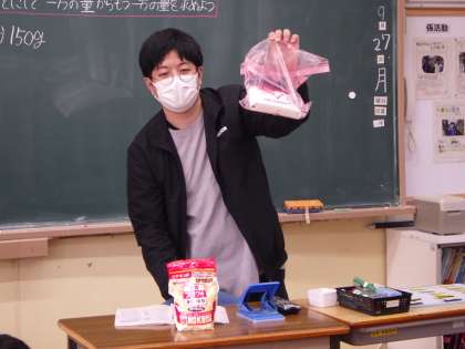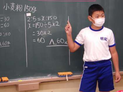 砂糖と小麦の重さの比が2:5の場合に、わかっている一方の量からもう一方の量を求める方法を考えました。比を利用して、同じ数をかけたりわったりして求められることがわかりました。