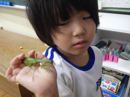 朝は「こわいから触れない」と言っていたカマキリ。午後には手に乗せているところを見せてくれました。生き物とふれあう中で、大きさや色、形や特徴をじっくり見ています。