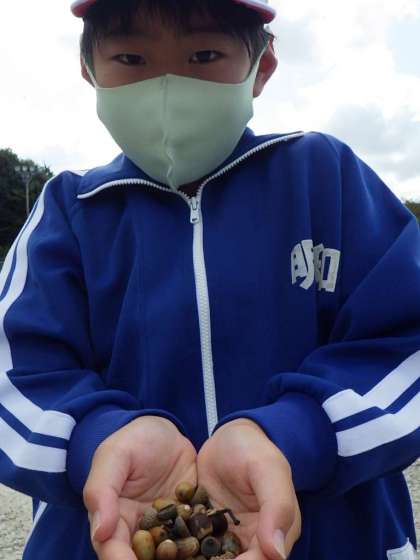 明和の子どもたちにとって、秋の道路にドングリの実が落ちているのは当たり前の風景ですが、今日はドングリの実、初拾い。…秋ですね。