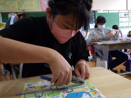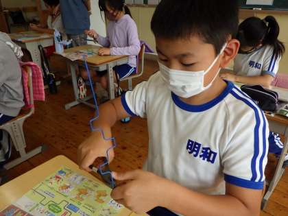 動くおもちゃをつくります。今日は、クランクの仕組みを知り、針金をペンチで直角に曲げました。針金につなげたストローの動き方から何をつくるか考えます。どんなおもちゃができるでしょうか。