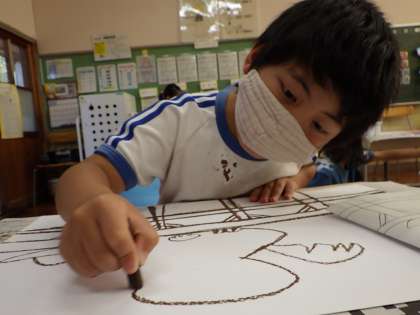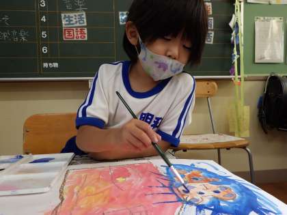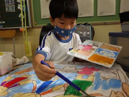 10月15日 1・2年図工「ことばのかたち」 公開日 2021/10/15 更新日 2021/10/15 各学年から 「はじめてのおきゃくさん」を読んで思い浮かんだことを絵に表しています。今日は絵の具で色をぬりました。読み聞かせから想像を膨らませて、動物やコックさんを描いています。