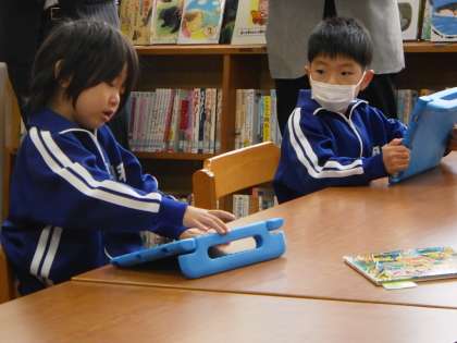 10月21日 学校訪問4(1年国語) 公開日 2021/10/21 更新日 2021/10/21 各学年から 図書室でいろいろな本の表紙を見て「表紙からどんなお話か考えよう」という学習をしました。「ともだちほしいなおおかみくん」の表紙を見ておおかみがこわいと予想しました。先生に本を読んでもらい、実はおおかみくんはとてもやさしいことを知りました。本への関心が高まっています。