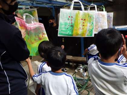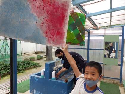 10月27日 1・2年図工「ぺったんコロコロ」 公開日 2021/10/27 更新日 2021/10/27 各学年から スタンピング遊びやローラー遊びでお気に入りの色や形をつくりました。友だちがつくった色や形を見て、「かごみたいできれい」「どうやってできたの?」等と感想や質問を言い合いました。