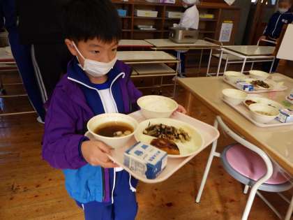 子どもたちは給食が大すきです。当番以外の子も「今日の給食は何かな?」とのぞきに来ます。給食当番はてきぱきと配膳ができます。