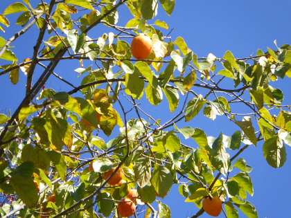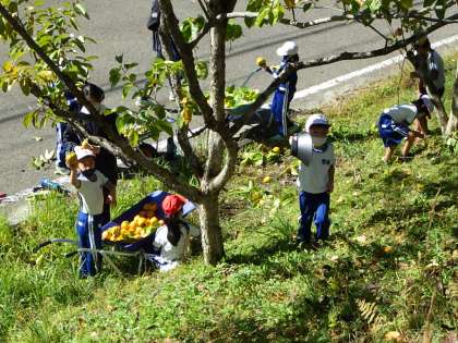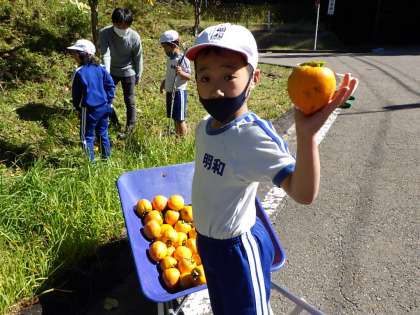 実りの秋です。学校の敷地には柿の木があります。今日は1・2年生が柿の実を収穫しました。先生が高枝切りばさみで切った柿を子どもたちが拾いました。