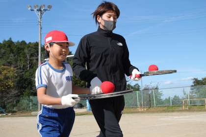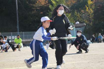 親子種目も得点種目でした。親子でてをつなぎ、ラケットに乗せたボールを運びました。笑顔がこぼれました。