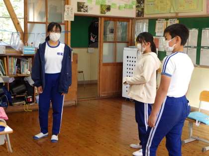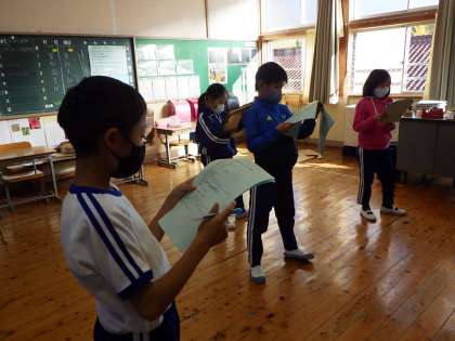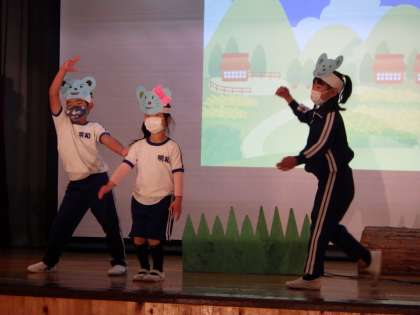 1・2年生は「ねずみのよめいり」、3・4年生は「タイムマシンでGO!〜めいわ時空探偵団〜」、5・6年生は「ライオンキング」の劇を行います。各学年で劇の練習に取り組んでいます。言い方や動き方を考えて、役になりきって表現しています。