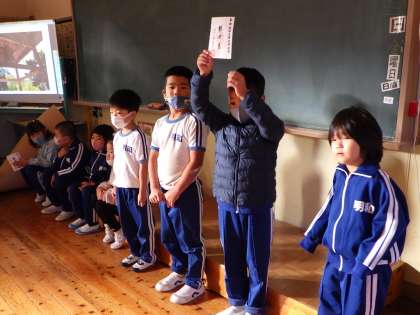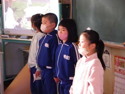 11月5日 1・2年地域探検発表会 公開日 2021/11/05 更新日 2021/11/05 各学年から 1・2年生が3・4年教室に行って、地域探検について発表しました。写真に合わせて、心に残ったことを伝えました。3・4年生は真剣に聞き、「明川にヤギがいることを知らなかったから行ってみたい」「紙を見ないで言えてすごい」等と感想が言えました。