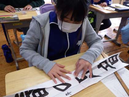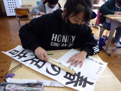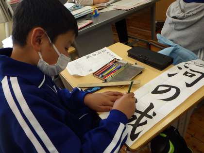 11月5日 5・6年書写の授業 公開日 2021/11/05 更新日 2021/11/05 各学年から 書写の授業では、1月7日(金)の書初め大会に向けての練習が始まります。今日はお手本に中心線などの線を入れる作業をしました。5年生は「春の足音」、6年生は「三河の城」という字を書きます。