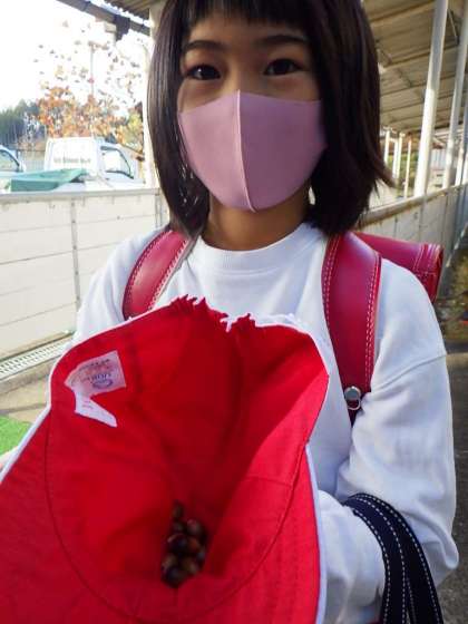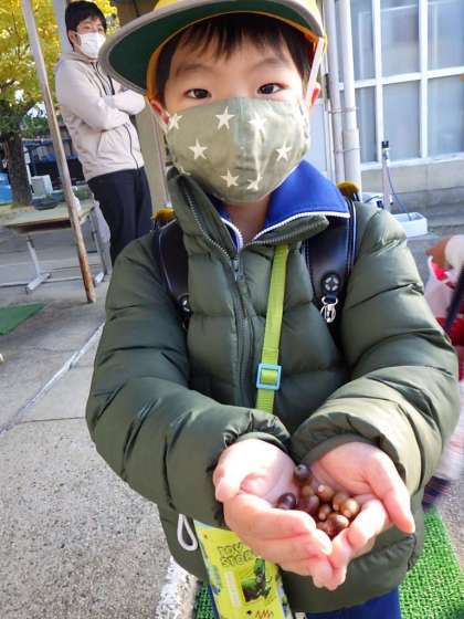 登校した手にはドングリ。帽子にはドングリ。秋ですね。
