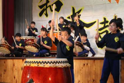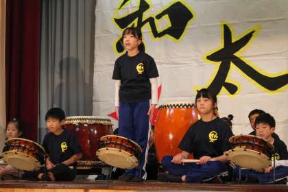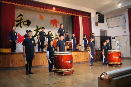 学芸会の始まりは明和太鼓でした。全校児童22人で13年目の伝統を継承します。