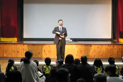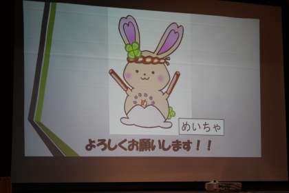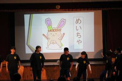 校長先生のお話の流れで、5・6年生が明和小学校のマスコットキャラクターを発表しました。夏休み明けから、5・6年生が中心になって全校のみんなにアンケートや投票を行い、ついに「めいちゃ」が出来上がりました。うさぎがモチーフになった理由は、長年飼っていたメッセが亡くなってしまい、その思い出からです。「めいちゃ」をどうぞよろしくお願いします。
