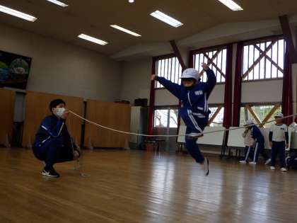大縄跳びをしました。一人跳び、二人跳び、跳び越しジャンプなどいろいろな跳び方を楽しみました。