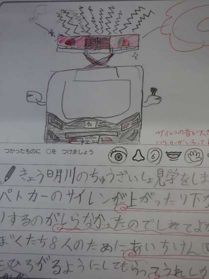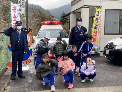 生活科の学習で、明川駐在所の見学に出かけました。駐在所では、交通安全の大切さやパトカーの機能を教えていただきました。子どもたちはパトカーに乗せてもらったり、無線で名古屋の指令局から明和小学校の1・2年生宛てにメッセージを送っていただいたりしました。初めて駐在所に行って、知らないことをたくさん学んで楽しかったようです。