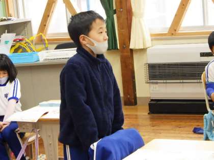 きまりを守る大切さを考えました。みんなで使う一輪車を男の子2人が倉庫裏に隠しておいて休み時間ごとに遊び、ある日の全校朝会で先生がその一輪車を全校のみんなに見せるお話です。「いい方法だったのに見つかってくやしいな」「こんな大ごとになるなんて思っていなかった」「やばい、ばれちゃったよ」…男の子の気持ちを想像して発表します。「やっぱり隠さなければよかったな」「悪いことだから」男の子の後悔や反省にも気付きます。決まりを守って気持ちよく生活しましょう。
