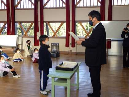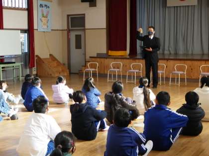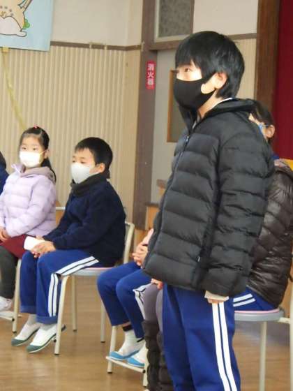 冬休み前集会を行いました。標語やポスター、マラソン大会の表彰がありました。その後、代表者7名がスピーチをしました。「算数をがんばった」「もっと運動に取り組みたい」など、振り返りや抱負を発表しました。校長先生が全校の子どもたちに、今年決まった学校のマスコットキャラクター「めいちゃ」のしおりを贈られました。