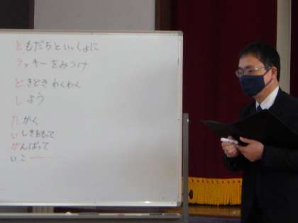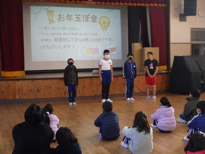1月7日 冬休み明け集会 公開日 2022/01/07 更新日 2022/01/07 学校行事 校長先生からは寅年を文の始めに「と」もだちといっしょに「ラ」ッキーを見つけ「ど」きどきわくわく「し」よう「た」かく「い」しをもって「が」んばっていこ「ー」というお言葉がありました。その後、運営委員会から、「お年玉募金」の説明がありました。