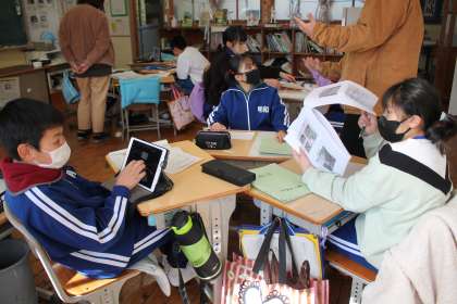 グループごとにポスターに書く内容を考え、書き進めています。一つの目標に向かってグループで協力し合います。これからの学びのスタイルです。