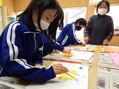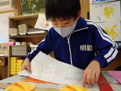 「版を刷ろう」の2回目の授業でした。手順を覚え、ていねいにローラーで色を付け、刷ることができました。