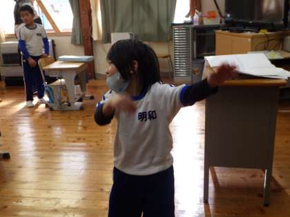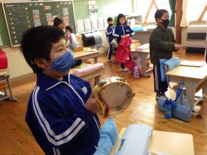 1月28日 1・2年音楽 公開日 2022/01/28 更新日 2022/01/28 各学年から 「とんくるりんぱんくるりん」のリズムに合わせて動きを考え、踊りながら歌いました。その後、タンバリン、すず、カスタネットでリズム奏を楽しみました。