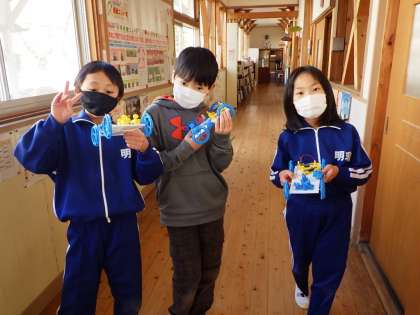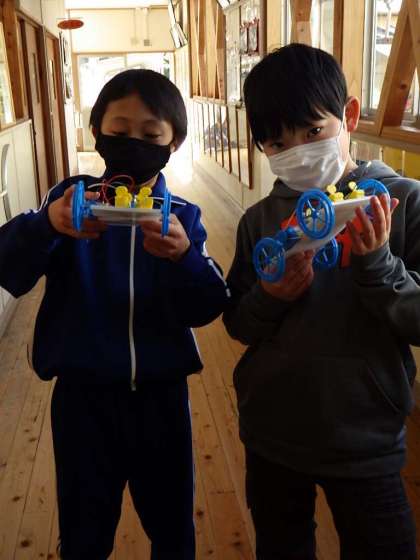 乾電池で動くモーターカーを作りました。プロペラや豆電球も付いていて速く走ります。「電池のはたらき」を体験を通して学んでいます。