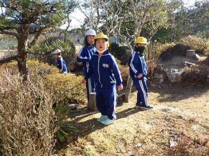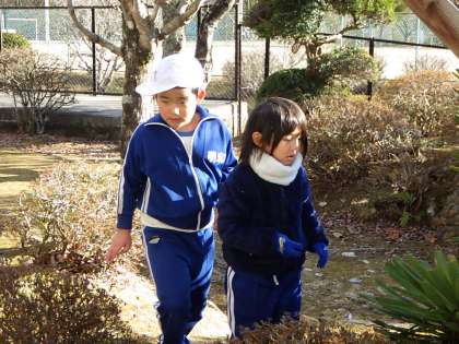 下校前に1・2年生が遊んでいました。葉っぱにこけを乗せて「先生、ご飯です」と見せてくれました。