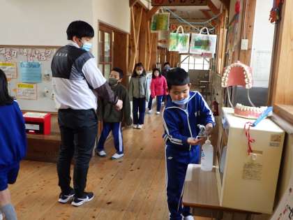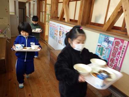並んで待ちます。学年ごとに取りに行きます。教室で静かにいただきます。