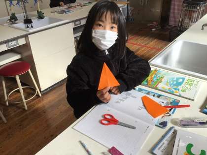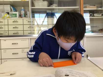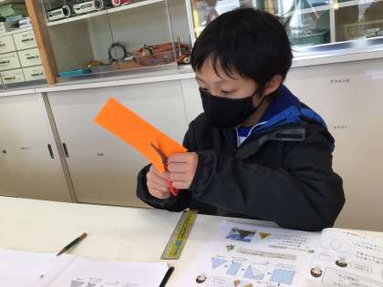 色紙を折ったり切ったりして、二等辺三角形をつくりました。紙がばらばらになったり四角形ができたりして、どうすれば2つの辺の長さが同じ三角形ができるかを考えました。中心になる折線の大切さに気付きました。