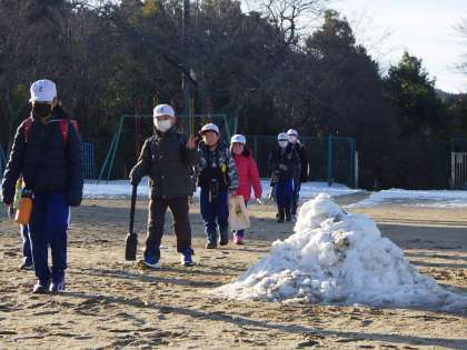 2月9日 雪解けが進む陽気でした 公開日 2022/02/09 更新日 2022/02/09 学校の特色ある活動 雪が解けて運動場がぬかるむ中、長靴を履いて登校する子もちらほらです。力を合わせて作ったトンネルも崩れています。渡り廊下の雪だるまは2つに増え、解けています。
