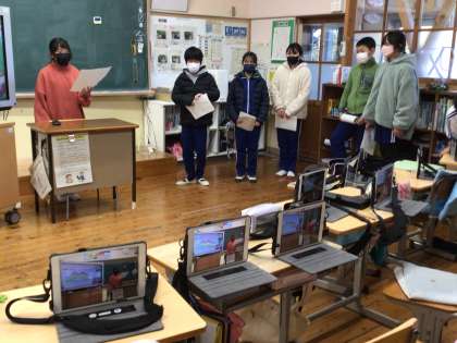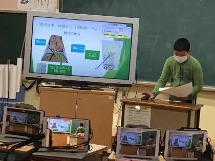 明日の授業参観は中止になり、予定していた生活科、総合的な学習の発表会はタブレットで録画をして、ご家庭で観ていただきます。今日は5、6年生がリハーサルをしました。