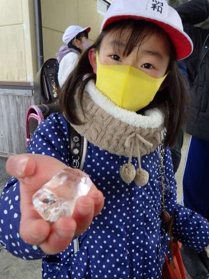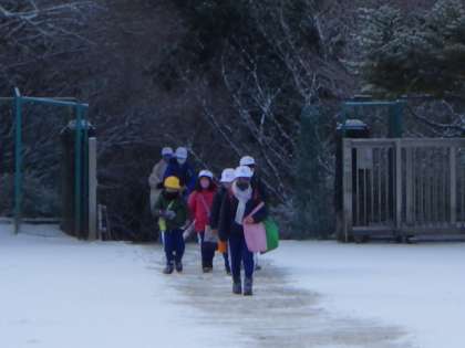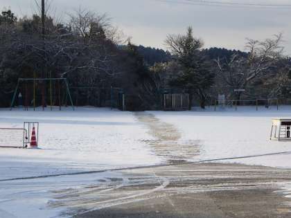 運動場にはうっすらと雪が積もっています。気温は氷点下3度、子どもたちは元気に登校しました。