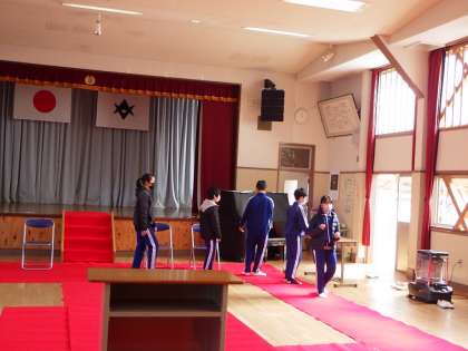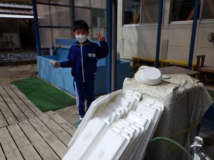 6年生は今日も卒業式の練習をします。ペンキを塗った水道の横に式で並べる鉢花を置く皿が準備してあります。今できることを…みんながそれぞれ頑張っています。
