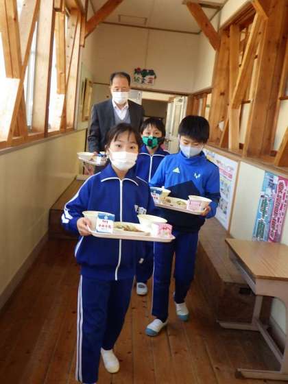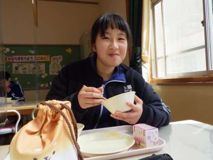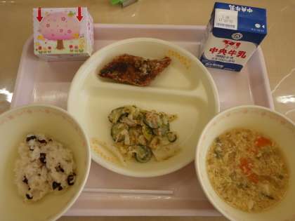 今日の給食は「卒業祝い献立」でした。赤飯やイチゴケーキに大喜びでした。