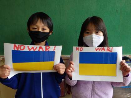 先日、「世界一美しいぼくの村」の学習を終えて戦争の悲しさ、苦しさ、悔しさを知りました。今、実際に悲しい戦争が起こっています。プーチン大統領に手紙が届くならどのような言葉を伝えたいかを書きました。「戦争をやめてください」「戦争のない世界にしたいです」「これ以上死者を出さないで」…発表しながら子どもたちは涙を流しました。この祈りが届きますように。