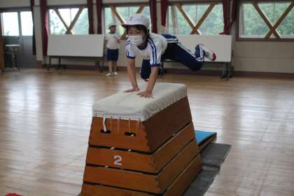 5月31日(火)に3・4年生が体育科で跳び箱運動をしました。タブレットで自分の跳ぶ姿を動画に撮り、自分のよいところと直したほうがよいところを見つけるなどしながら、運動に取り組みました。