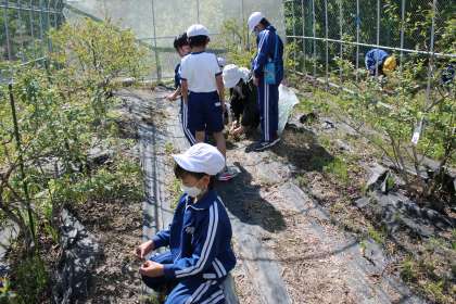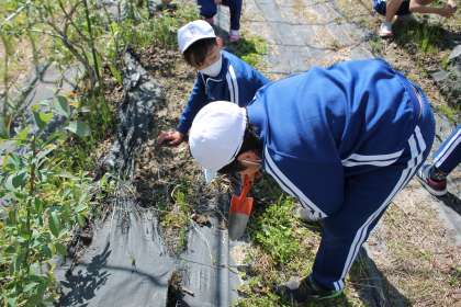 5月2日(月)に3・4年生が総合的な学習の時間において、ブルーベリー園の草取りを行いました。先日草取りをしましたが、すぐにまた生えてきており、子どもたちは一生懸命草取りに取り組みました。
