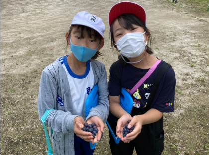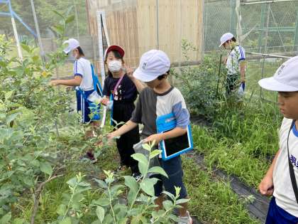 7月7日(木)に3・4年生がブルーベリーの収穫を行いました。春から夏にかけて、草取りをするなど世話をしたブルーベリーの木にたくさんの実がなりました。