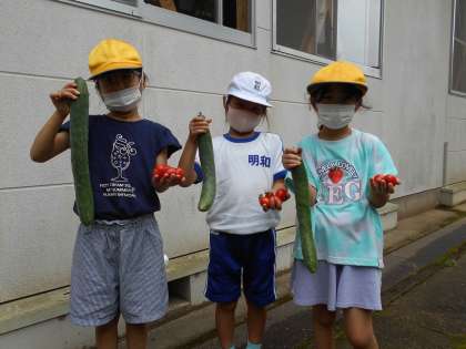 8月23日(火)に1・2年生が生活科で育てた野菜の収穫をしました。売られているよりも大きく成長した野菜ができました。