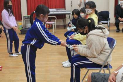 6年生を送る会(2) 公開日 2023/03/02 更新日 2023/03/02 学校行事 3〜5年生の子が6年生のために、心を込めて作ったプレゼントを渡しました。プレゼントを渡すとき、今までそばで支えてくれた6年生に感謝の気持ちを伝えました。6年生の出し物では、これはだれの○○でしょうゲームを行いました。6年生の絵や声などに、1〜5年生のとびきりの笑顔が見られました。終始心温まる素敵な会でした。