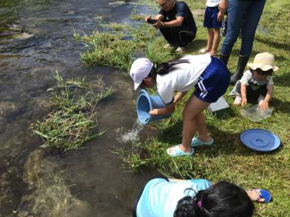 例年明和小の児童も多く参加していますが、今年も14名が名倉川漁協立ち合いのもと、バケツに入れた稚鮎を川に放流しました。