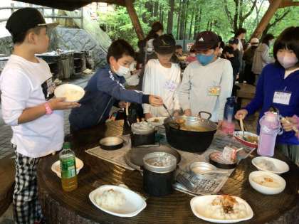 野外炊飯、火起こし、飯盒炊爨、カレーの食材切り、煮込み。