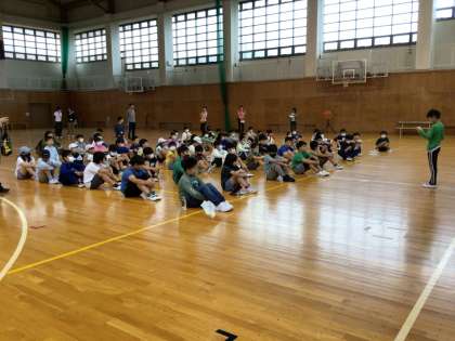 小雨のため、体育館で朝の集いを行いました。