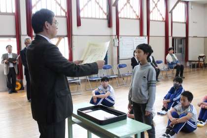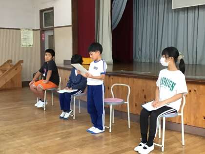 10月6日(金) 前後期切替式 公開日 2023/10/06 更新日 2023/10/06 校長室から 5時間目に前後期切替式を行いました。 14:05開始予定のところ、14時には全員が集会室に集まり、静かに待っていました。予定よりも少し早く開始できました。 全国川づくり標語コンクール、文詩集「ひまわり」、読書感想文の表彰の後、代表児童4名によるスピーチがありました。前期に頑張ったことと後期に頑張りたいことをしっかり伝えることができました。 式の最後の校歌も元気よく歌いました。