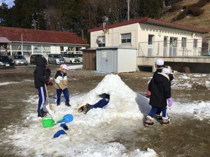1月25日(木) 雪遊び4 公開日 2024/01/25 更新日 2024/01/25 校長室から 元気タイム、気温は1度。運動場から地面が少しずつ現れてきました。 かまくらは完成に近づいています。新たな遊びも始まりました。