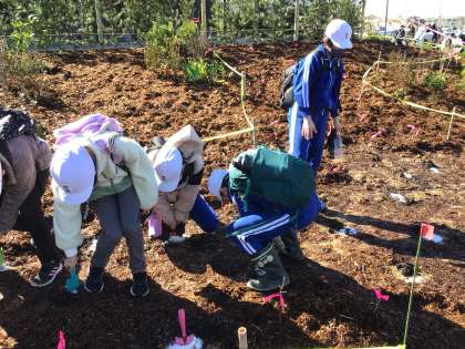 2月26日(月) どんぐりの森プロジェクト(高学年) 公開日 2024/02/26 更新日 2024/02/26 校長室から 豊田市博物館の開館にあたり、市内の多くの小学校が「どんぐりの森プロジェクト」に参加しています。 明和小もこのプロジェクトに参加し、本日、2年間育ててきたどんぐり(アベマキ)の苗を植樹しました。 持ってきた苗を水につけ、博物館の中でビデオを観ました。
