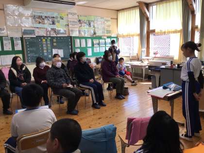 学区の様子から、課題(お年寄りが多い)を見つけ、お年寄りの生活など理解を深めるために取り組んできた活動を振り返り、今日の発表会を迎えました。