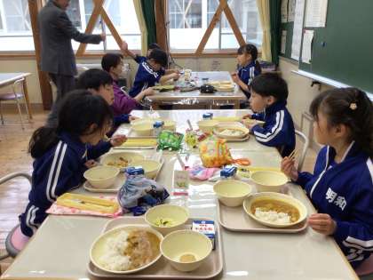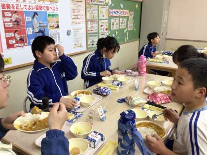 4月5日(金) 給食開始 公開日 2024/04/05 更新日 2024/04/05 校長室から 1年生にとって、小学校で初めての給食でした。 今日のメインメニューはカレーライス。 残さず、もりもり食べました。 片付けもきちんとできました。