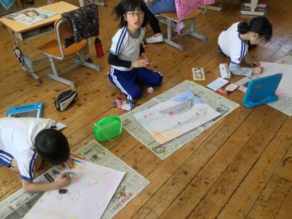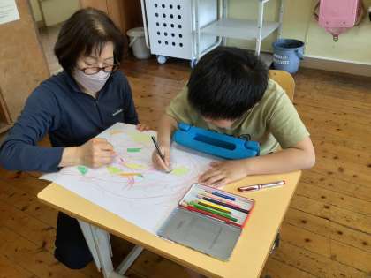 3・4年生は校庭で好きなものを見つけて写真を撮り、自分の好きなものと組み合わせて絵を描きました。