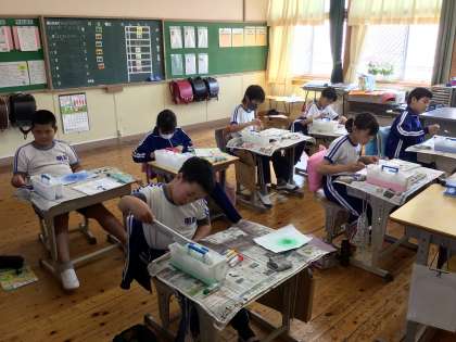 5・6年生は水彩絵の具を使って水の量を加減しながら同心円を描きました。